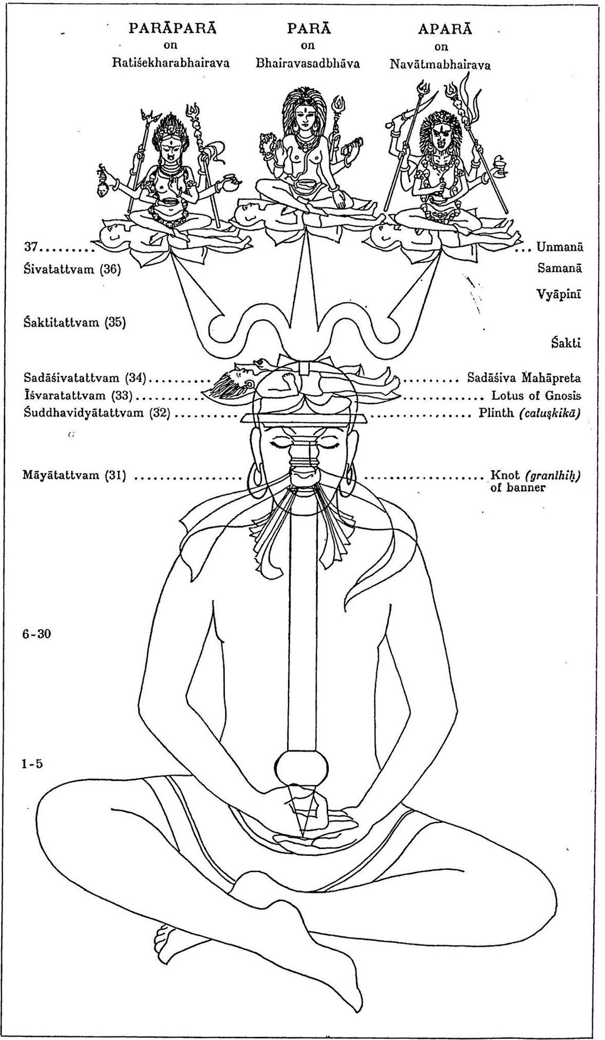 Via Vidur Mishra (image) and Bob Lang (description) The image is a diagram from Kashmir Shaivism, a school of Hindu philosophy. It illustrates the concept of tattvas (principles of reality) and the three goddesses—Parā, Parāparā, and Aparā, who represent different aspects of divine energy (Śakti). The three figures at the top of the diagram represent the Trika goddesses: Parāparā (transcendent-immanent) sits on Ratiśekharabhairava. Parā (supreme) sits on Bhairavasadbhāva. Aparā (immanent) sits on Navātmabhairava. These goddesses represent the three stages of Śakti (divine energy) and are central to the Trika system. The numbers and labels on the left and right sides of the diagram refer to the 36 tattvas of Kashmir Shaivism, which are principles of reality that describe the descent of consciousness from the divine to the material world. The diagram shows the higher tattvas in the head region, with the lower tattvas extending down the body. The human figure in a meditative pose represents the practitioner, and the diagram illustrates the path of spiritual ascent through the tattvas to realize the ultimate reality of Śiva. English Translations og Sanskrit terms in the image: PARĀPARĀ: Supreme-unsupreme or transcendent-immanent PARĀ: Supreme APARĀ: Immanent Ratiśekharabhairava: A form of Bhairava (a fierce manifestation of Śiva). Bhairavasadbhāva: The essential nature of Bhairava. Navātmabhairava: The nine-fold self of Bhairava. Unmanā: Beyond mind. Samanā: Equalized consciousness. Vyāpinī: Pervasive. Śivatattvam (36): The principle of Śiva. Śaktitattvam (35): The principle of Śakti. Śakti: Divine energy Sadāśivatattvam (34): The principle of Sadāśiva. Sadāśiva Mahāpreta: Great corpse of Sadāśiva. Išvaratattvam (33): The principle of Īśvara. Suddhavidyātattvam (32): The principle of pure knowledge. Lotus of Gnosis: Lotus of knowledge. Plinth (catuṣkikā): A four-sided base or pedestal. Māyātattvam (31): The principle of Māyā (illusion). Knot (granthih) of banner: A knot or bind.